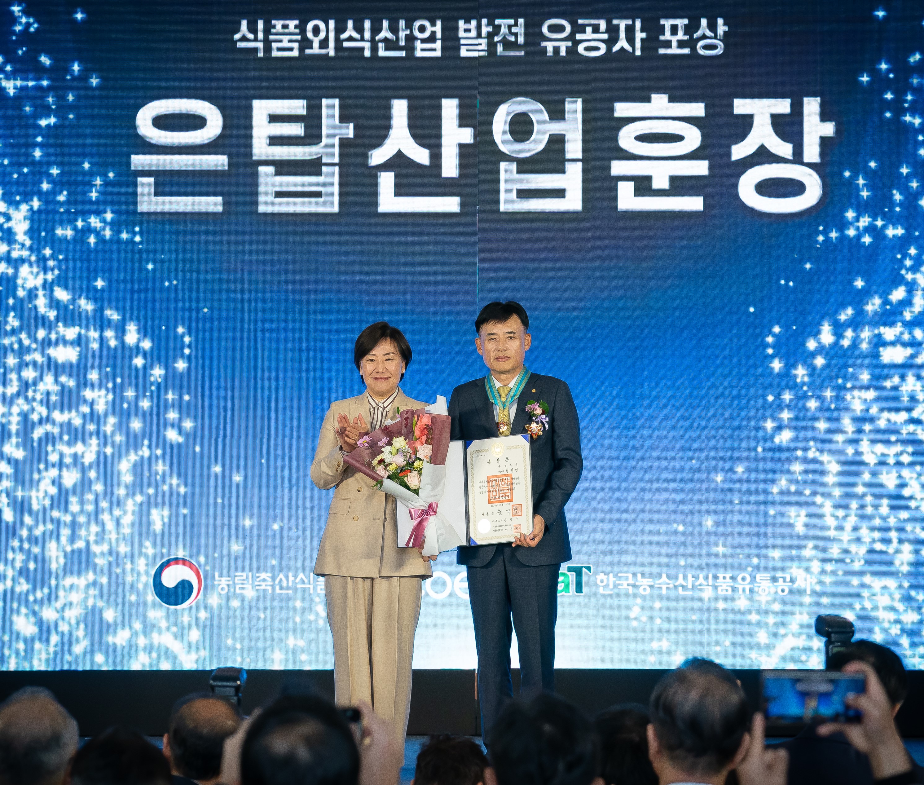 ‘Food Week 2024’ 개막식에서 오뚜기 황성만 사장이 국내 식품 외식산업 발전에 기여한 공로로 ‘ 은탑산업훈장 ’ 을 수훈하였습니다 . 농림축산식품부와 한국 농수산식품유통공사 공동주관의 이번 행사에서는 , 식품산업의 발전에 기여한 기업인 , 공무원 등 총 28 명에게 포상하였습니다 . 황성만 사장은 국내 외식산업 발전과 물가안정에 크게 이바지한 공로를 인정받아 수훈하게 되었습니다 .